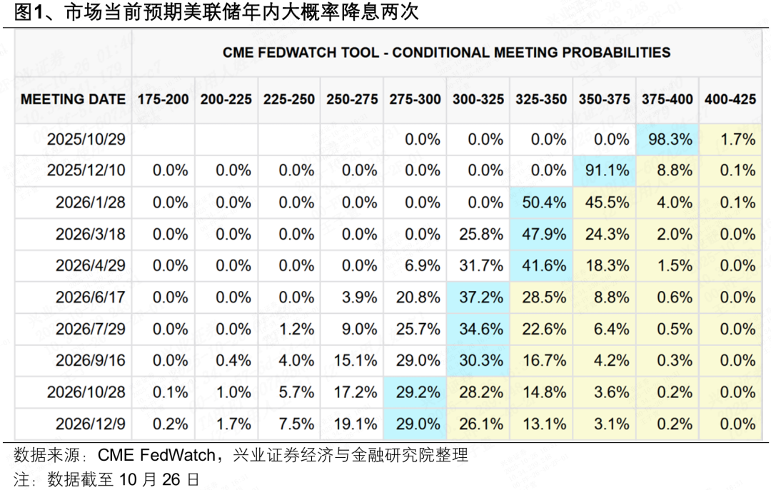 首先,中美进行贸易谈判、美联储降息预期强化,海外扰动最大的时刻或已逐步过去。一方面,中方代表确认于10月24日至27日赴马来西亚与美方举行经贸磋商。另一方面,美国9月CPI数据低于预期,反映通胀压力仍相对可控,市场当前预期美联储年内大概率降息两次,奠定全球宽松环境。