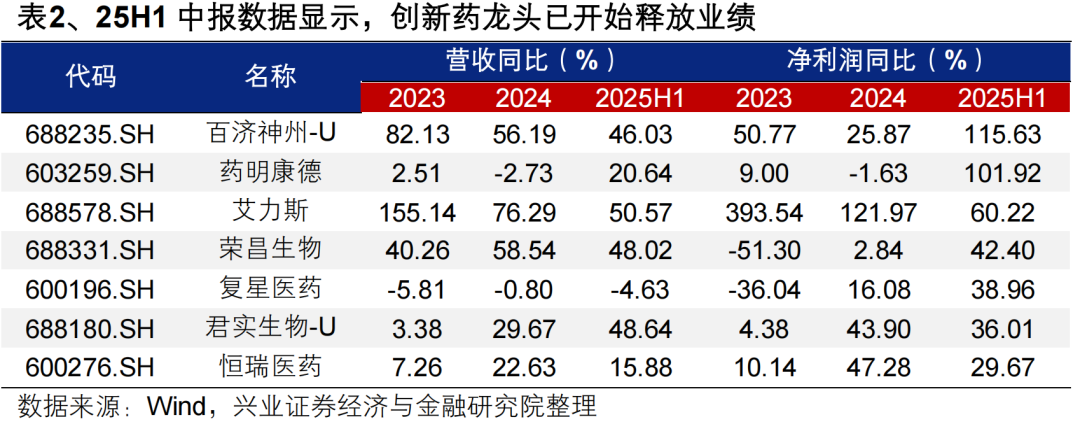 创新大周期下,多家创新药企产品获批上市销售,产业链逐步进入商业化阶段,龙头业绩已迎来释放,三季报有望继续验证产业链景气。25H1,以百济神州、药明康德、恒瑞医药为代表的创新药产业链龙头公司均有亮眼业绩表现。在新技术创新药和潜力大单品驱动下,企业多年来的投入迎来收获,产业链正在进入新一轮业绩释放期,三季报有望继续验证产业链景气。