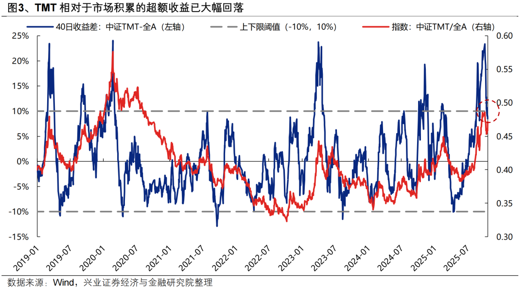 首先,经历前期调整消化,当前TMT与全A的滚动40日收益差已回落至合理水平,细分方向拥挤度压力显著回落,景气优势和产业趋势有望再次成为板块定价的核心。